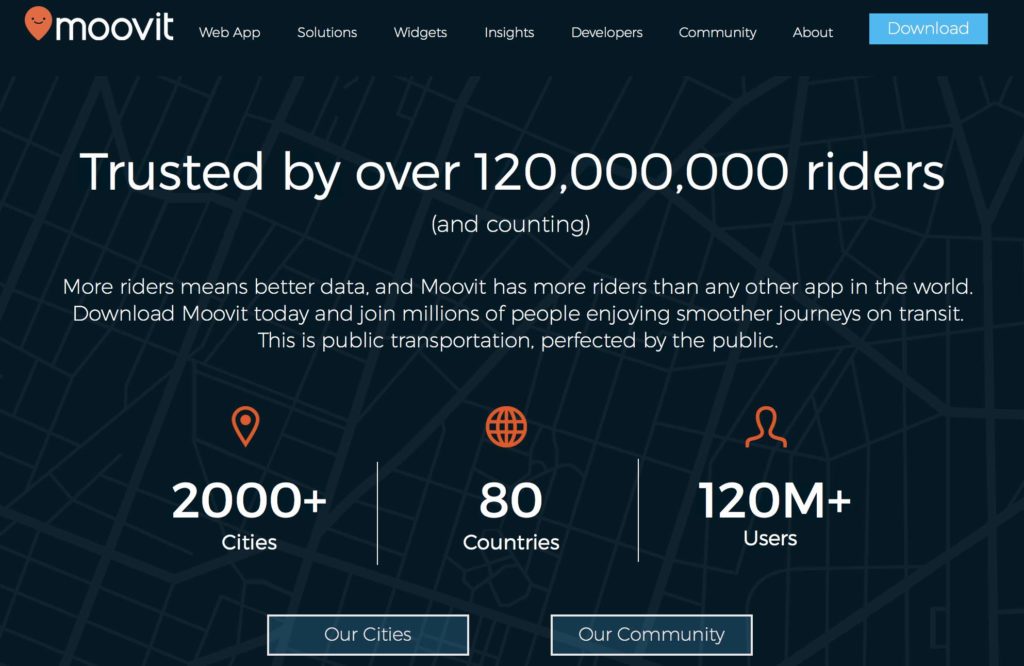 Moovit 是一款人人都可修改道路、进步搭车体会的敞开式城市公交地图服务,其具有全球最大的公共交通数据库,一起每天仍有10亿条的数据点不断生成。Moovit将其特有的数据研制成才智出行方案 ,协助政府及公共交通企业更好地办理其交通体系。其已掩盖全球80个国家和地区的2000多座城市,总用户数量为1.2亿人,共有44个言语版别。