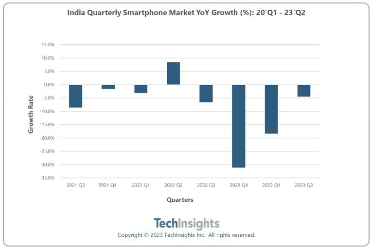 TechInsights:2023 Q2 印度智能手机出货量同比下降 5%,市场开启复苏模式