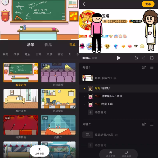 据了解,用户翻开这款APP后会默许进入发明页面,用户在选定画面场景和物品、建立布景后,然后便可添加动画人物或旁白,并且只需将每个人物的台词以文字方式输出,即可主动转化为动画人物的配音。
