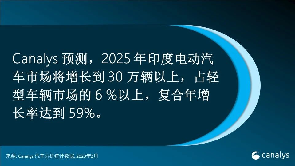 印度政府的“更快选用和制作混合动力以及电动轿车”(FAME)方案第二阶段旨在经过车企的鼓励方针,快速带动印度全国范围内的电动轿车销量。该方案将持续扶持车企开拓商场,补助将于2024 年 3 月 31 日完毕。Canalys猜测,2025 年印度电动轿车商场将增加到 30 万辆以上,占轻型车辆商场的 6 %以上,复合年增加率到达 59%。